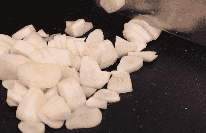 На цю кількість салату потрібна одна головка часнику. Очищаємо та нарізаємо пластинами.
