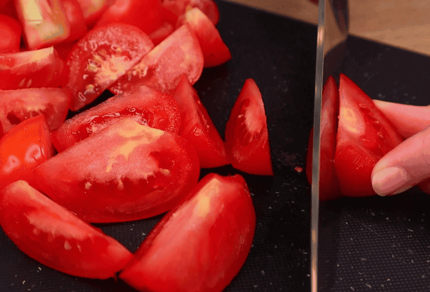 Помідори наріжемо часточками в залежності від їх розміру.