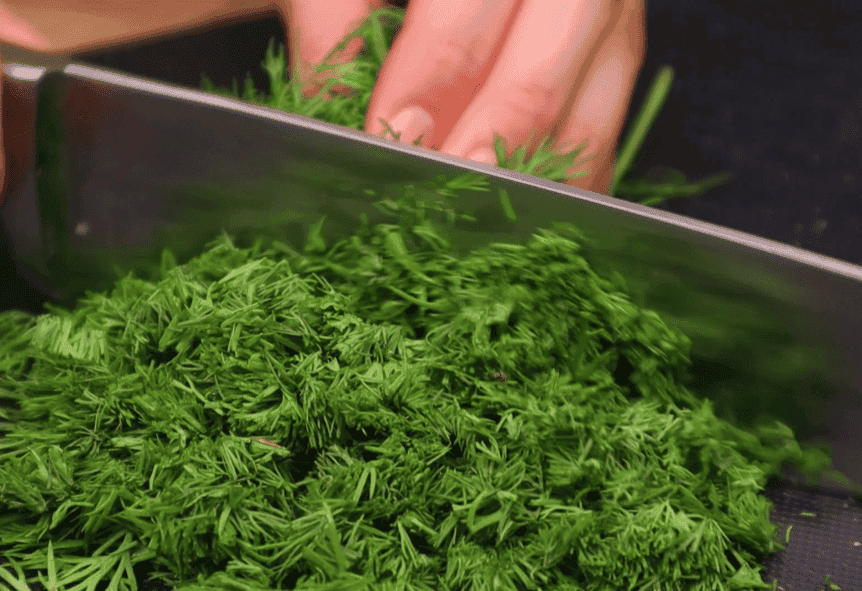 Потім нашаткуємо зелень, у мене це кріп, додамо до овочів. Замість кропу можна взяти іншу улюблену зелень і можна навіть додати трохи більше.