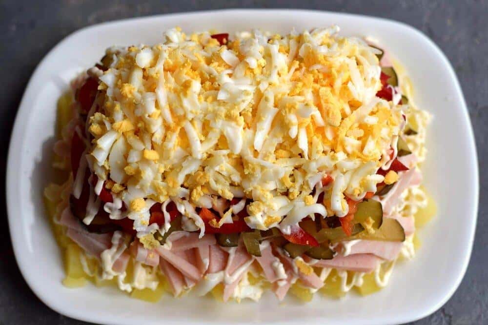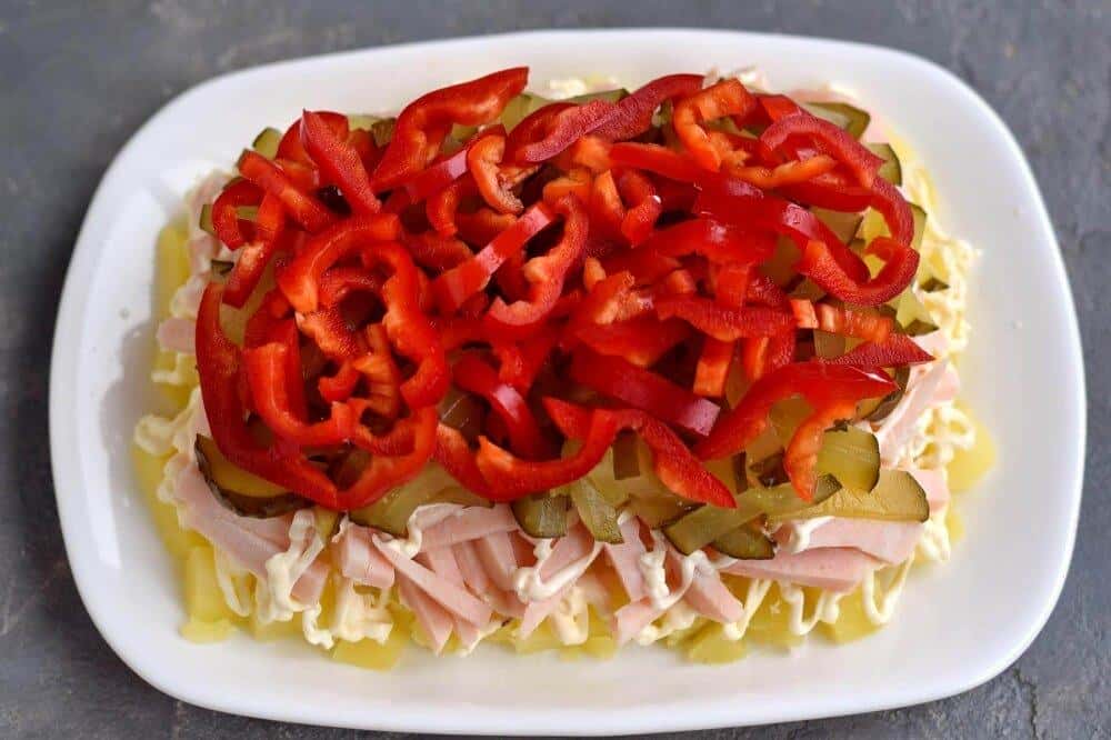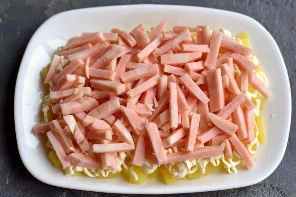 Шинку наріжте смужками, викладіть на картоплю, також покрийте майонезом.