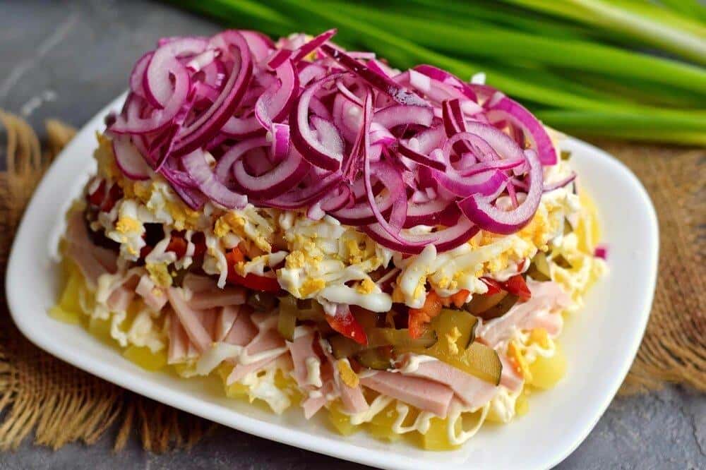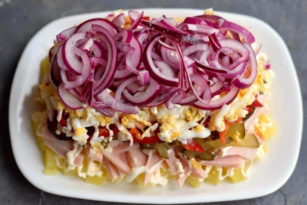 Салат отримав назву “Рожевий Фламінго” завдяки своєму зовнішньому вигляду. Червона салатна цибуля, яка прикрашає верхівку салату, нагадує забарвлення птиці фламінго. У салаті відмінно поєднується шинка, яйця, мариновані і свіжі овочі. Завдяки картоплі, салат виходить ситним, тому не вимагає при подачі додаткового гарніру. Шари салату при формуванні не варто притискати, щоб він вийшов повітряним і легким.