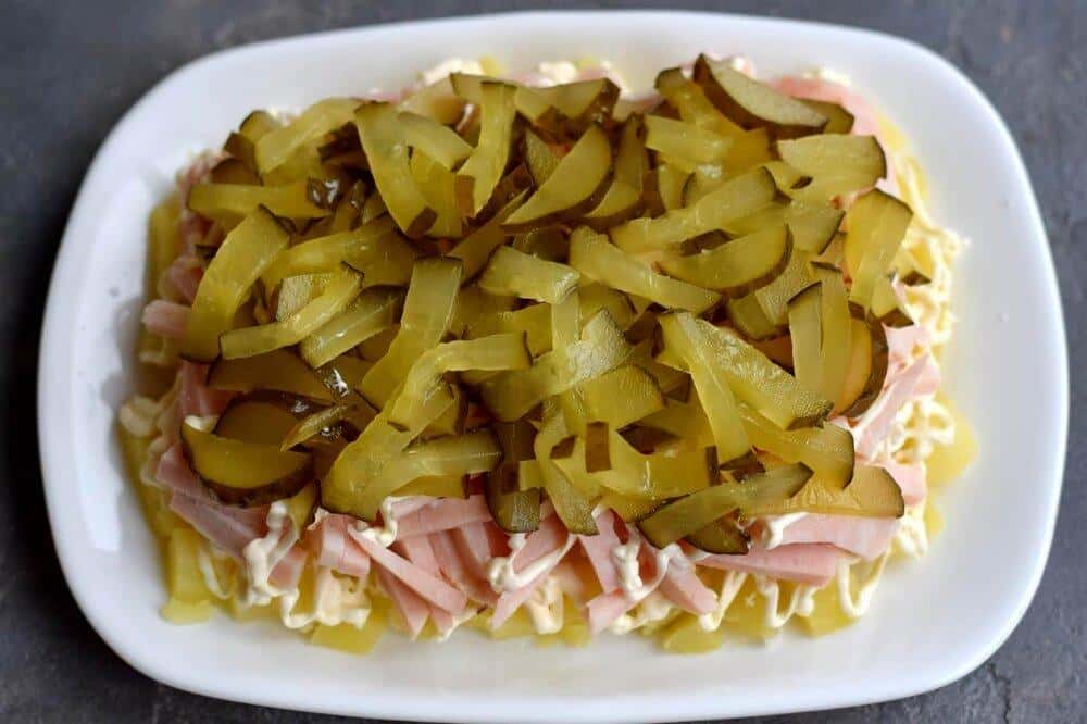 Мариновані огірки наріжте соломкою, укладіть рівним шаром на шинку.