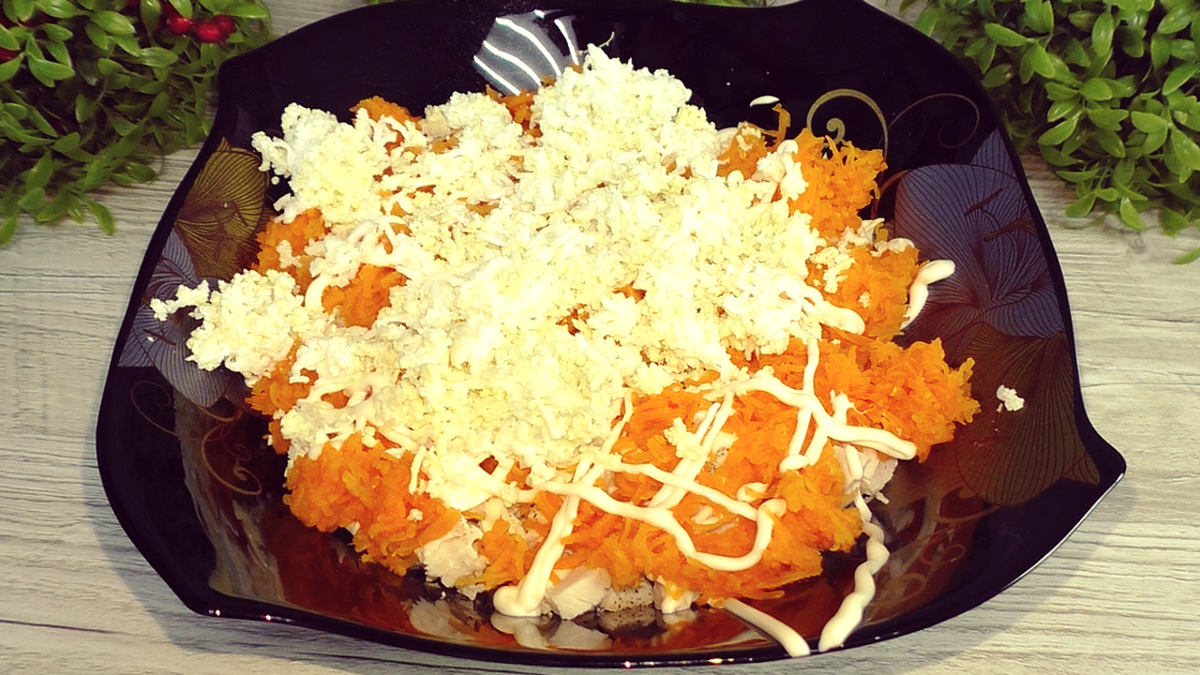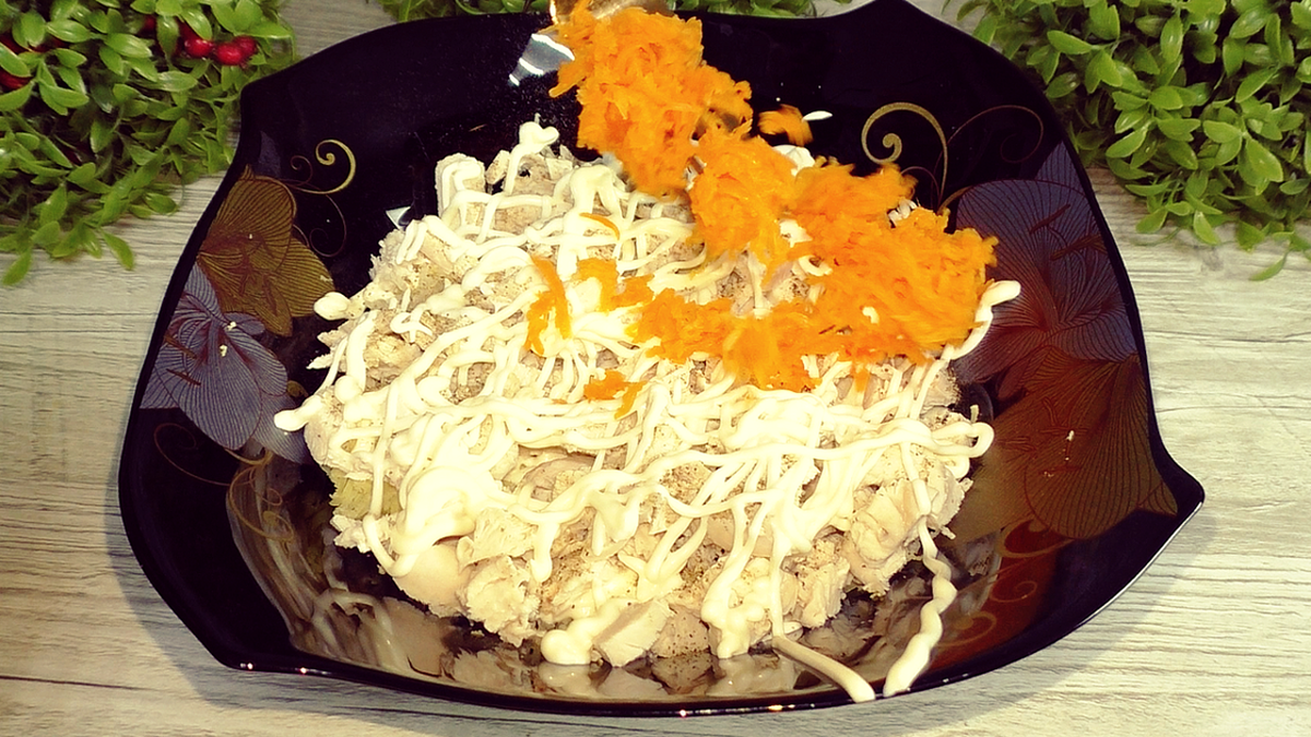 Далі натерта на дрібній терці моркву і сіточка майонезу.