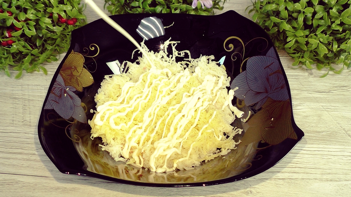На дно салатника (тарілки) на дрібній терці натерти картоплю, злегка посолити, я роблю сіточку з майонезу.