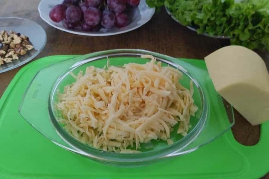 1. Підготувати необхідний набір інгредієнтів: виноград, твердий сир, волоські горіхи, сухий часник, салатне листя, майонез та житній хліб. Для цього салату найбільше підходять сири з м’яким солодкуватим смаком, наприклад, гауда, маасдам, сметанний або топлене молоко. А ось солонуватий сир, як на мене, підійде менше. Майонез краще використовувати якісний чи приготовлений у домашніх умовах. Житній хліб теж має бути якісний, солодкувато-пряний, наприклад бородинський.