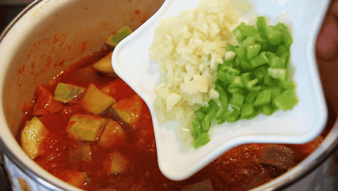 Коли кабачки стали м’якими, додаю дрібнонарізаний часник і гіркий перець. Проварюю ще хвилин 7-10.