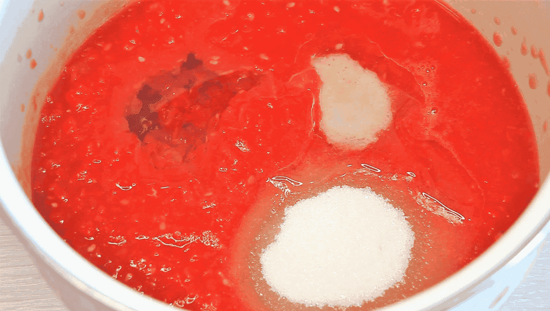 Переливаю масу в каструлю додаю сіль, цукор та олію. Варю на середньому вогні після закипання приблизно 10 хвилин.