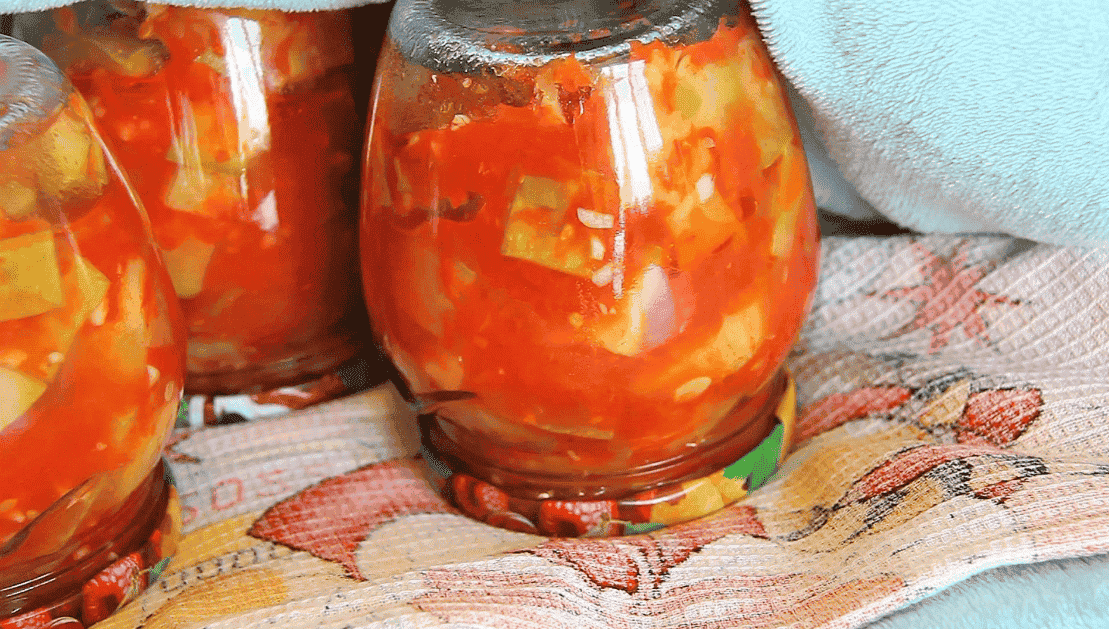Готовий салат розкладаю гарячим по чистих стерилізованих банкам, закручую кришками. Банки перевертаю вгору дном і вкриваю пледом. Так залишаю їх до повного остигання.