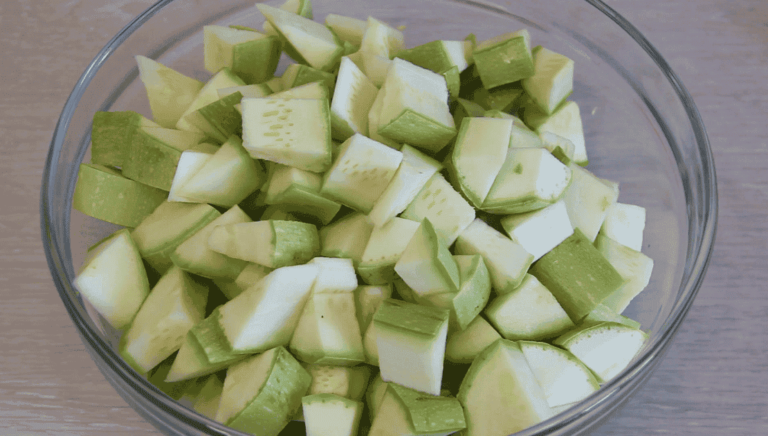Кабачки для салату підійдуть як молоденькі так і “старі”. У перезрілих плодів потрібно видалити шкірку та насіння. Нарізати кабачки також можна за бажанням (на смак це, звісно, не впливає). Гарно виглядатиме в закусці кабачки нарізані невеликими брусочками.