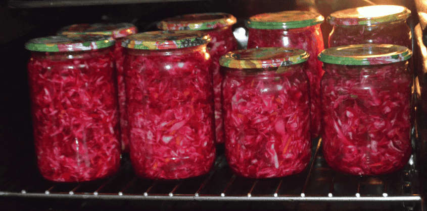 Банки накриваємо кришками, які також ми попередньо не стерилізуємо. Всі банки з салатом забираємо в холодну духовку, встановлюємо температуру 150 градусів, як тільки духовка розігріється до такої температури, засікаємо 15 хвилин.