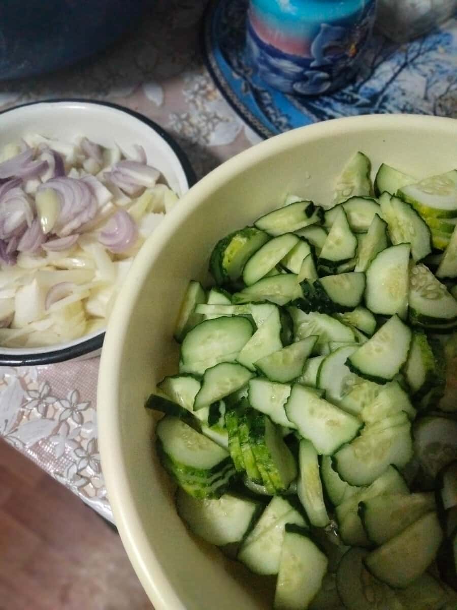 Салат готується дуже швидко, потрібно тільки підготувати продукти. Огірки я нарізала півкільцями, вони, як видно по фото, різнокаліберні. Цибулю нарізала пір’ячком. Часник натерла на терці.