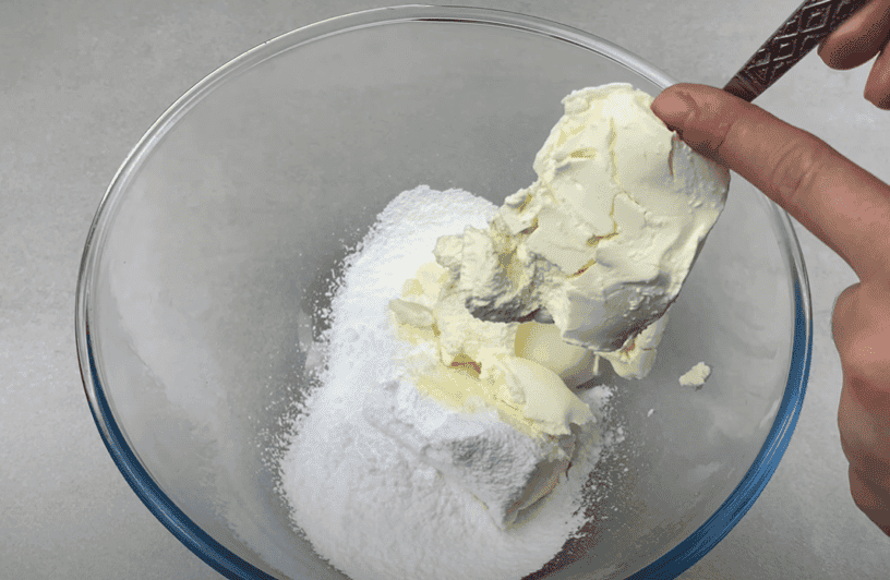 Для приготування крему в миску відправляємо м’яке вершкове масло, цукрову пудру і вершковий сир.