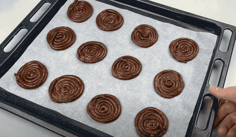 Перекладаємо тісто в кондитерський мішок. Застеляємо деко пергаментом. Відсаджуємо невеликі кружечки з тіста.