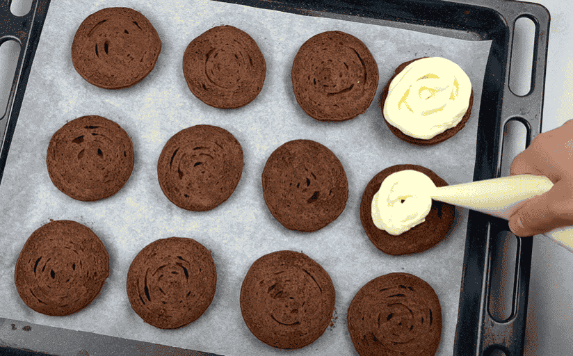 Перекладаємо крем в кондитерський мішок, переносимо його на печиво. Цієї кількості крему повинно вистачити на все печиво, тому не викладайте занадто багато крему.