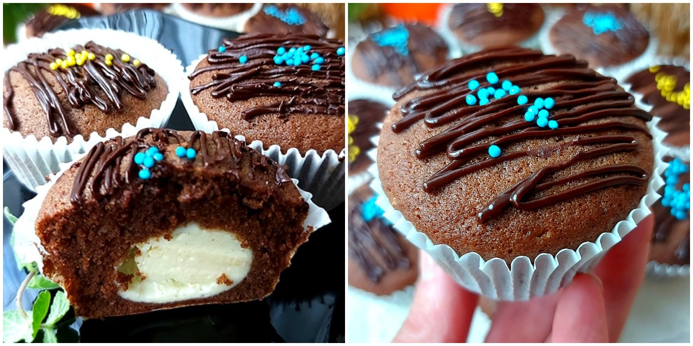 Шоколадне тісто викласти у формочку на 2/3, а тоді за допомогою кулінарного мішка ввести сирну масу у центр кекса. Випікати при 170 гр 20 хв.