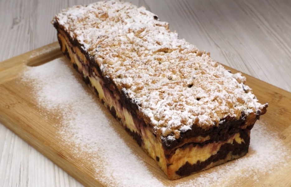 1. У форму для випічки розміром 9×28 см, застелену папером для випічки, натерти половину світлого тіста, а потім половину темного тіста.