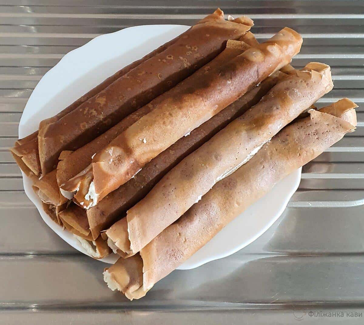 10 млинців змащуємо шаром отриманого крему товщиною 2-3 мм і загортаємо трубочкою.