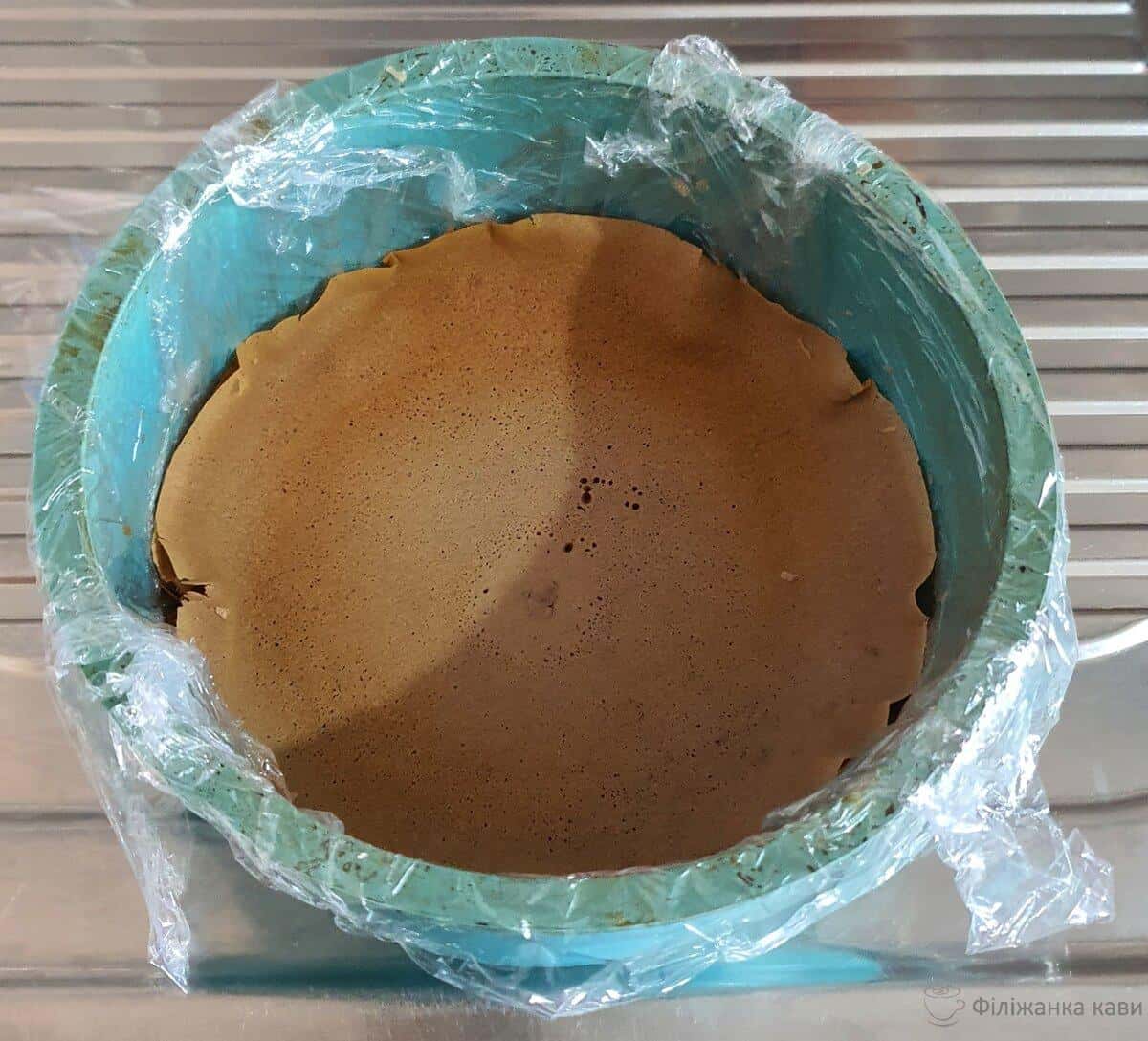 Форму застелити харчовою плівкою з невеликим напуском, для того щоб закрити потім цією плівкою низ торта.