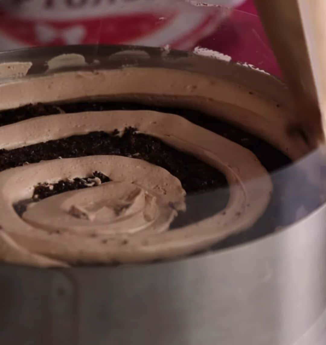 Зібрати торт у кільці з ацетатною стрічкою. Забрати в холодильник для стабілізації на 8 годин.