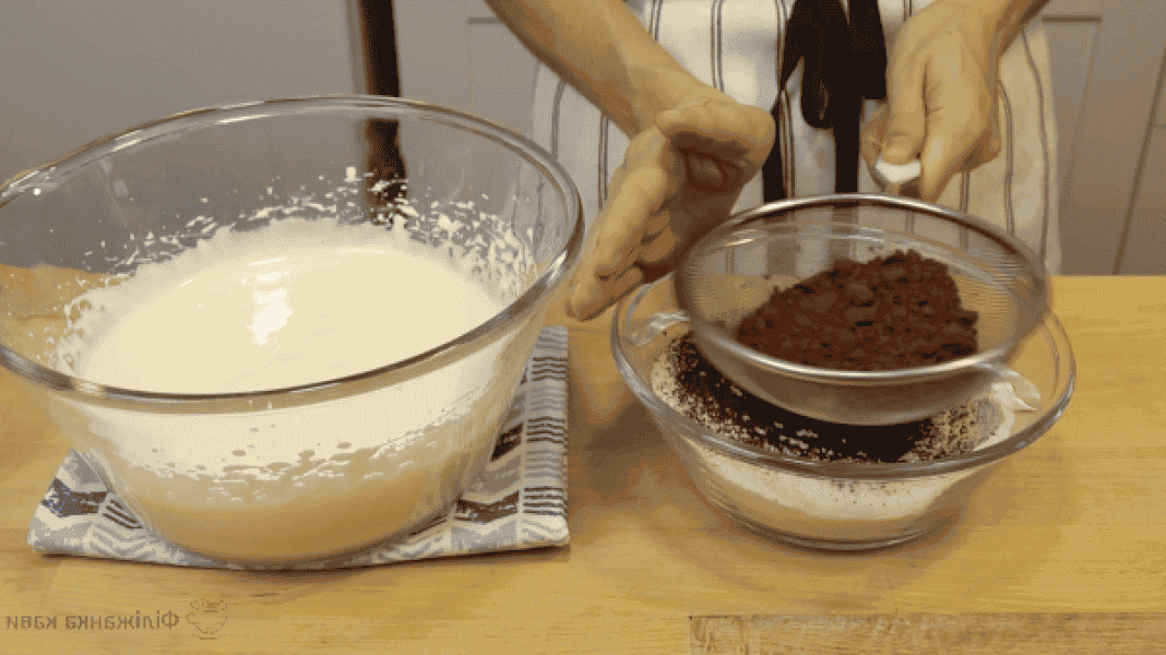 Какао — порошок просіваю в борошно ( обов’язково ), додаю розпушувач і залишився цукор ( 1/2 ).