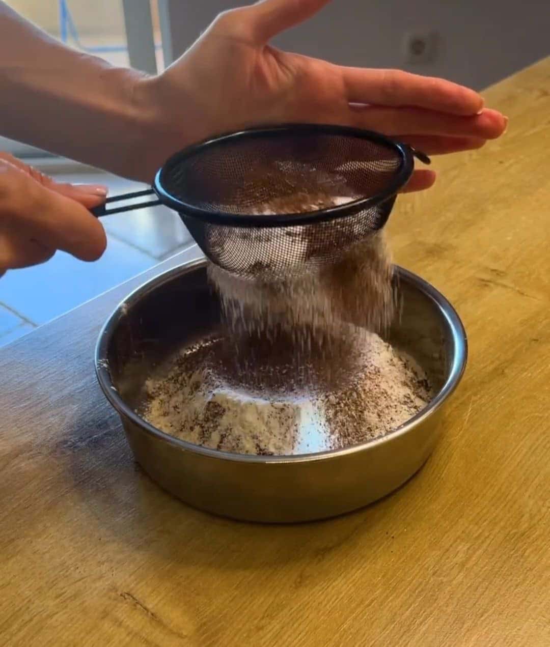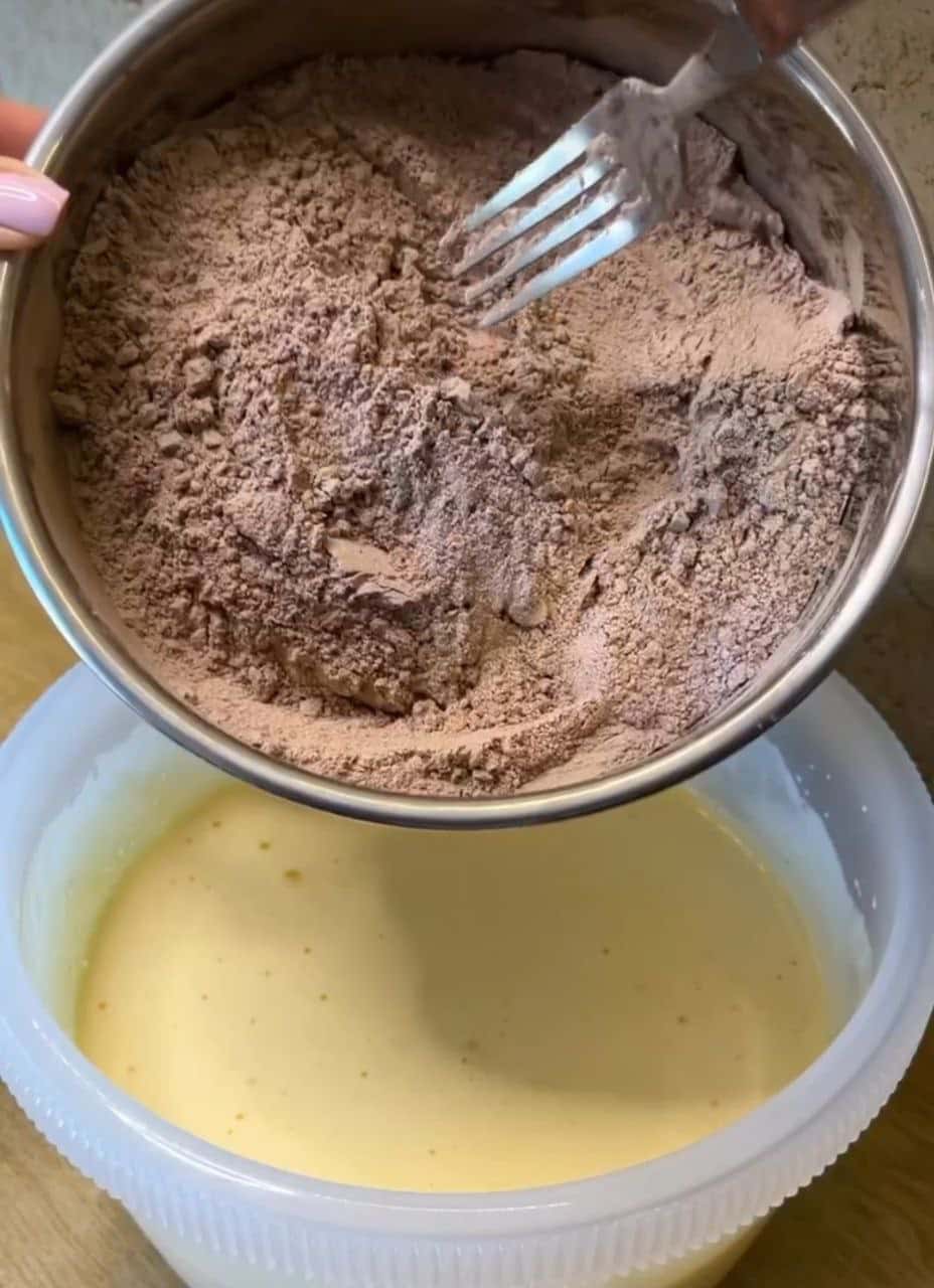 🟢До борошна просіюємо какао, розпушувач, змішуємо.