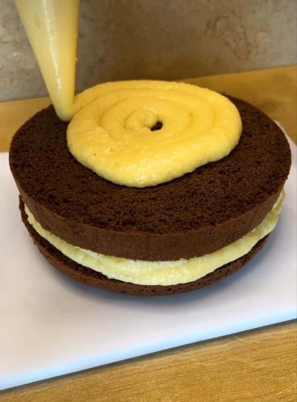 Збираємо торт: бісквіт – просочення – крем – бісквіт.