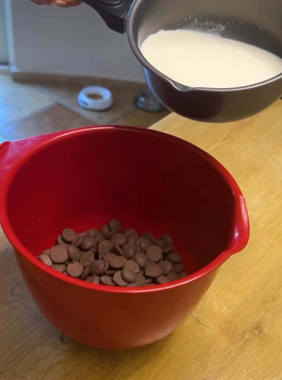 Вершки розігріваємо, заливаємо шоколад і добре змішуємо.