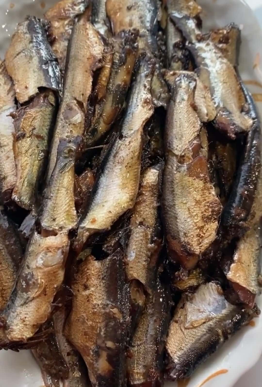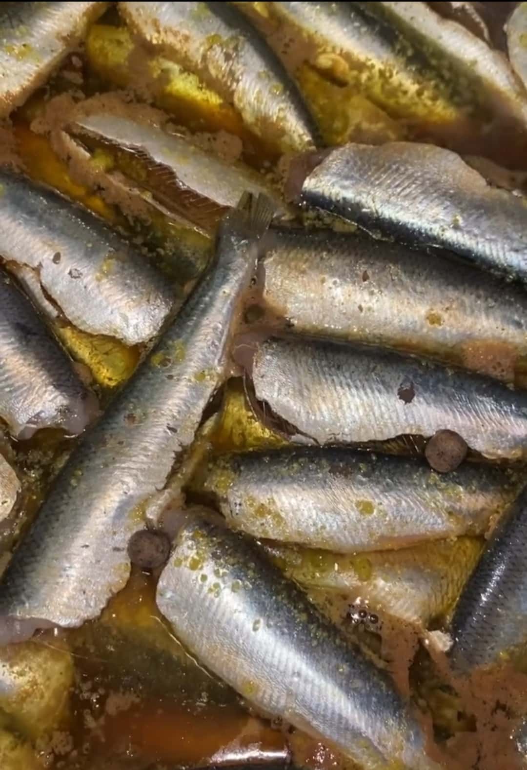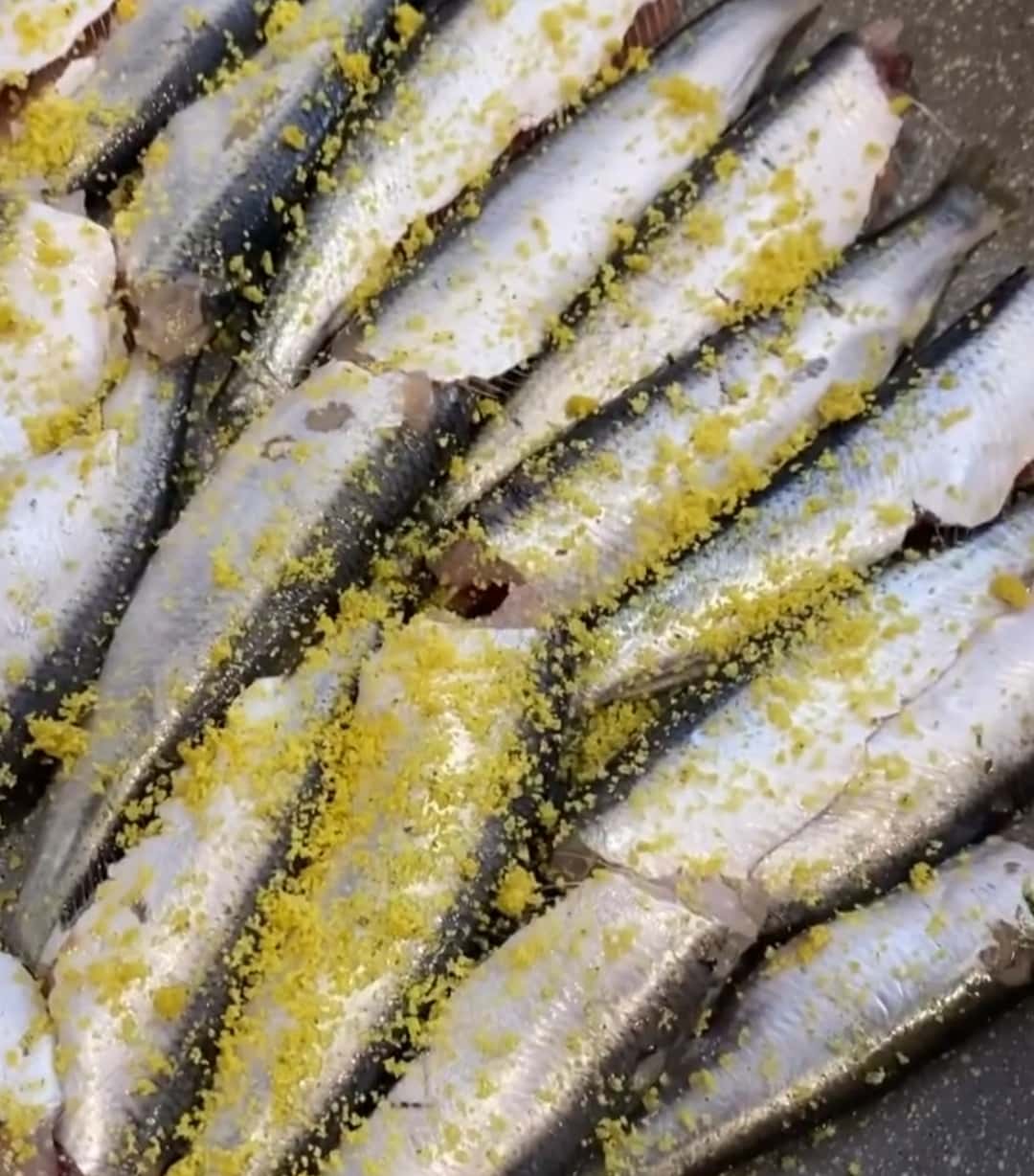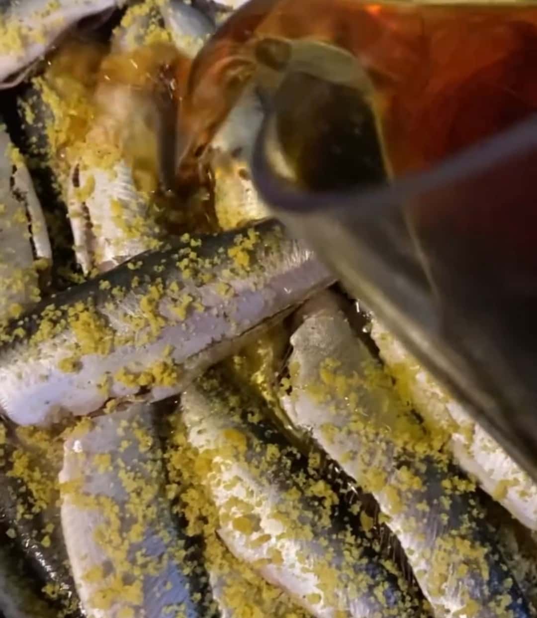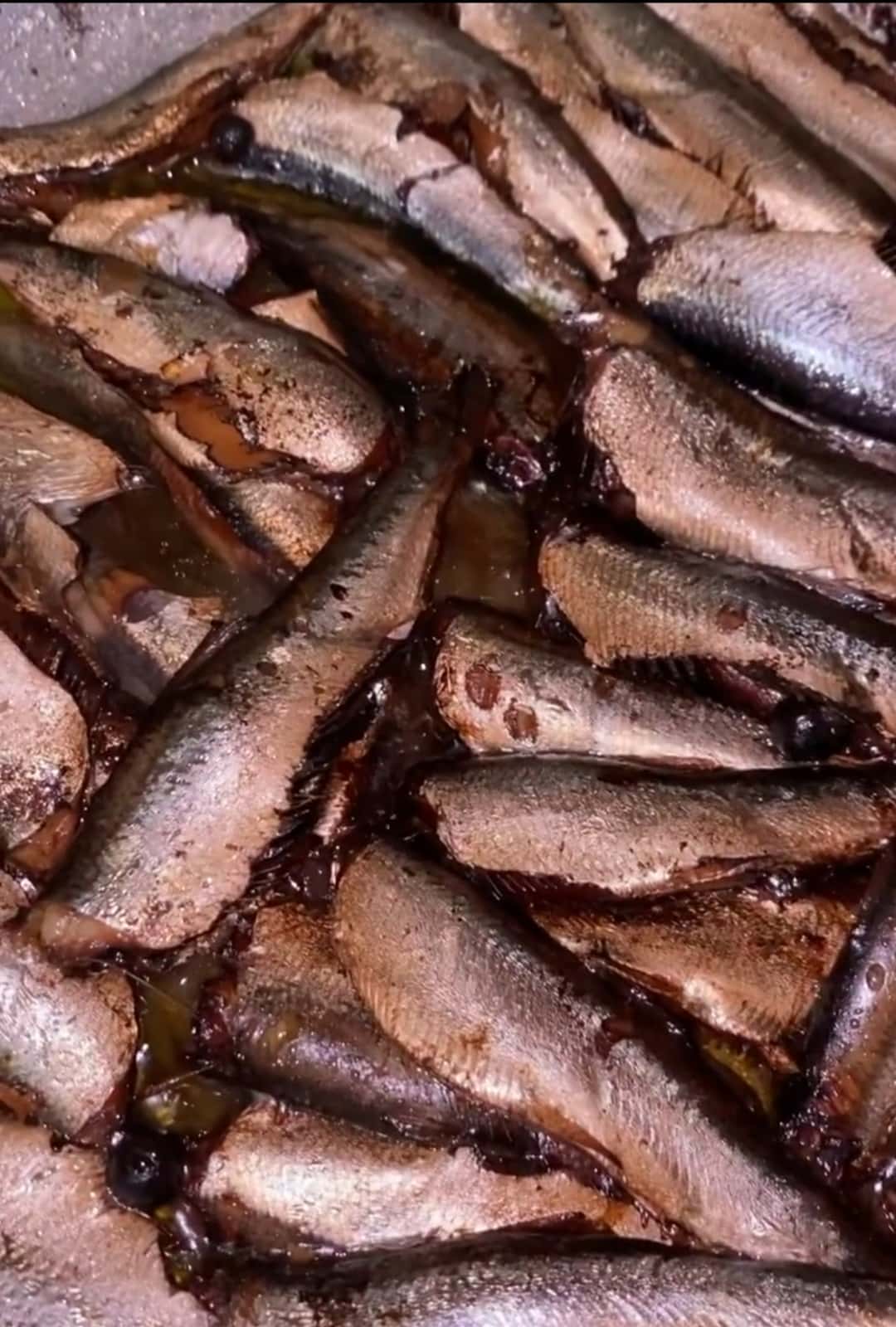 Домашні шпроти - Підготовлену рибку викладаємо шаром на сковорідку, зверху подрібнити кубик Gallina Blanca, і так викладаємо шарами, до закінчення рибки (на 1 кг рибки потрібно 3 куб. Gallina Blanca).