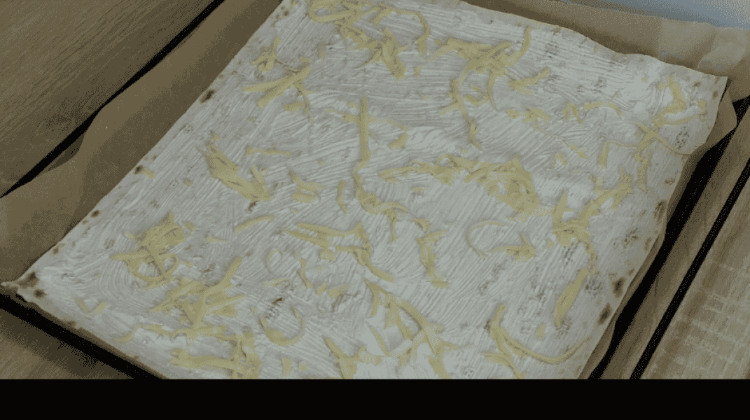 Лаваш розрізаємо на три однакові прямокутники. Беремо деко, застилаємо пергаментним папером і викладаємо перший лист тонкого лаваша, який ми підготували.
