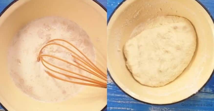 Насамперед приготуємо опару. Для цього в мисці з гарячою водою розведіть свіжі дріжджі із сіллю, 1 ст. л. цукру та 6 ст. л. борошна. Перемішайте та накрийте опару рушником.