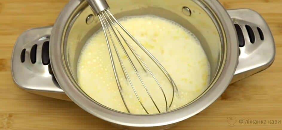 У невелику каструлю викладаємо яєчний жовток, додаємо цукор, кукурудзяний крохмаль, вливаємо молоко і гарненько перемішуємо вінчиком.
