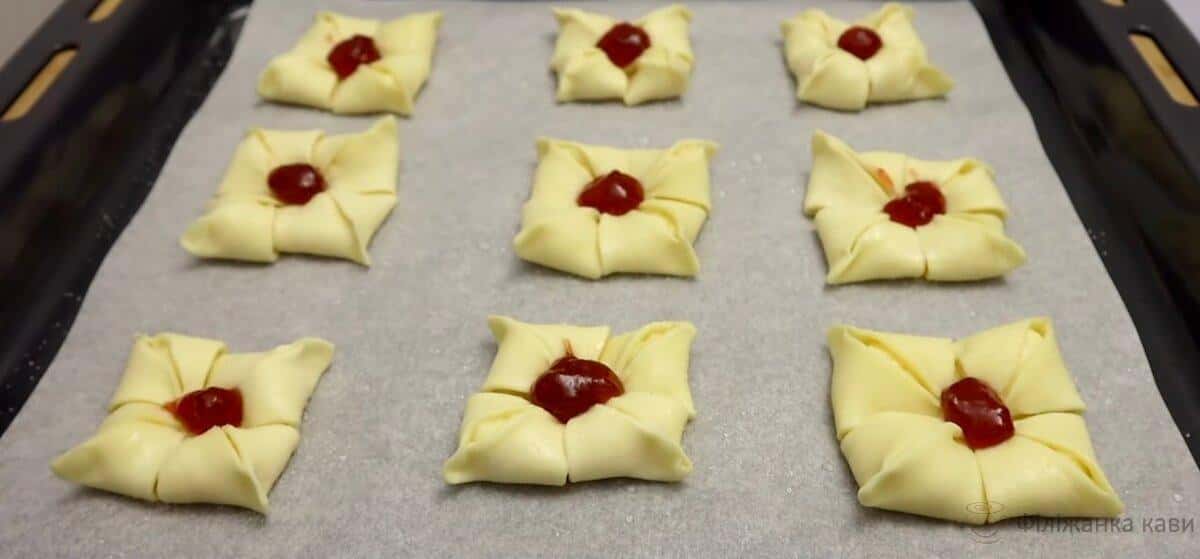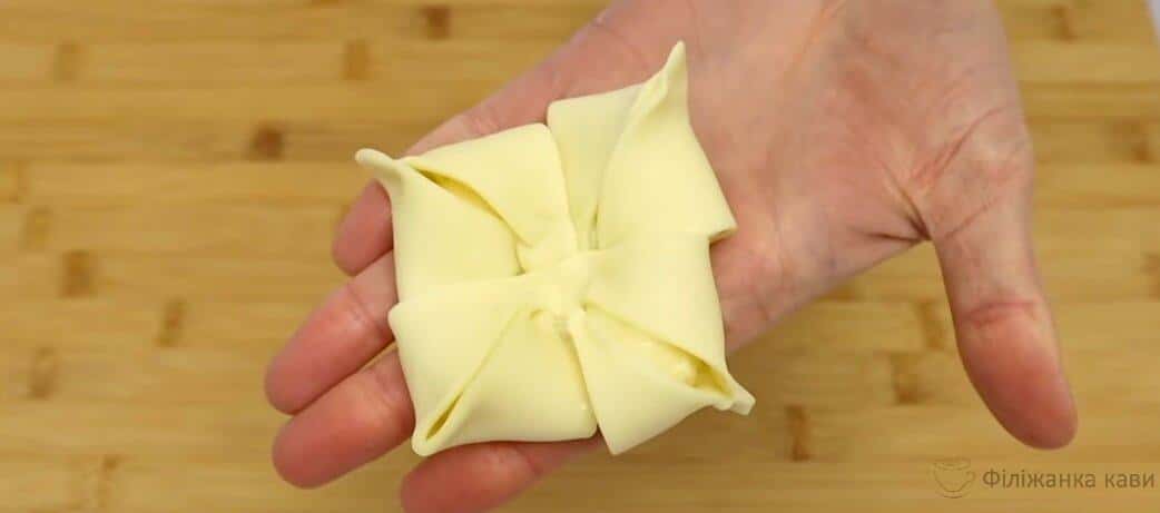 На кожному квадратику робимо надрізи на кутах. І в кожен трикутник викладаємо крем.