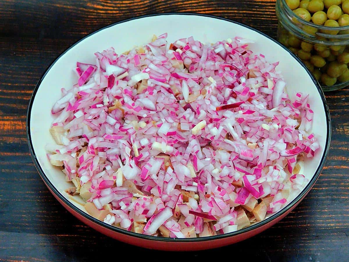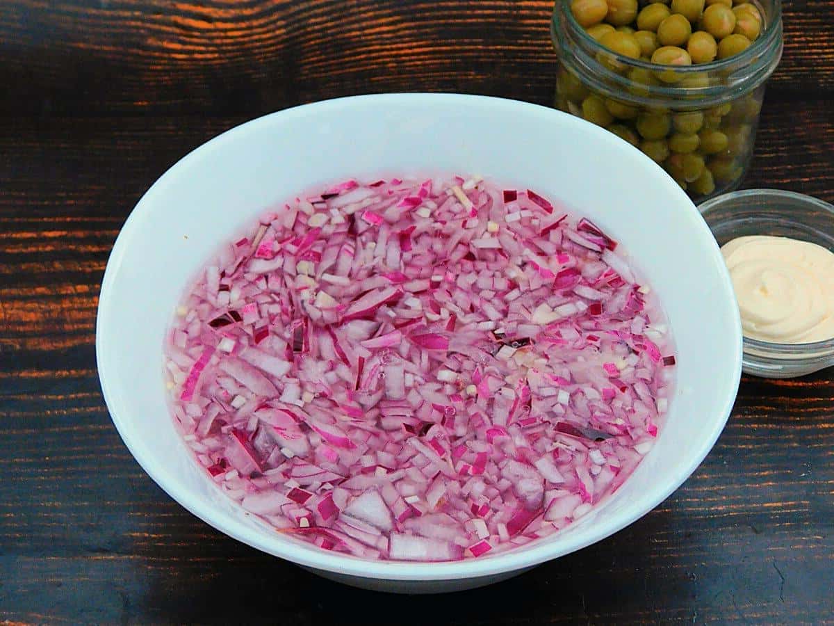 Зробити маринад з солі, цукру, оцту і води. Цибулю нарізати дрібним кубиком, висипати в рідину і залишити на 15 хвилин.