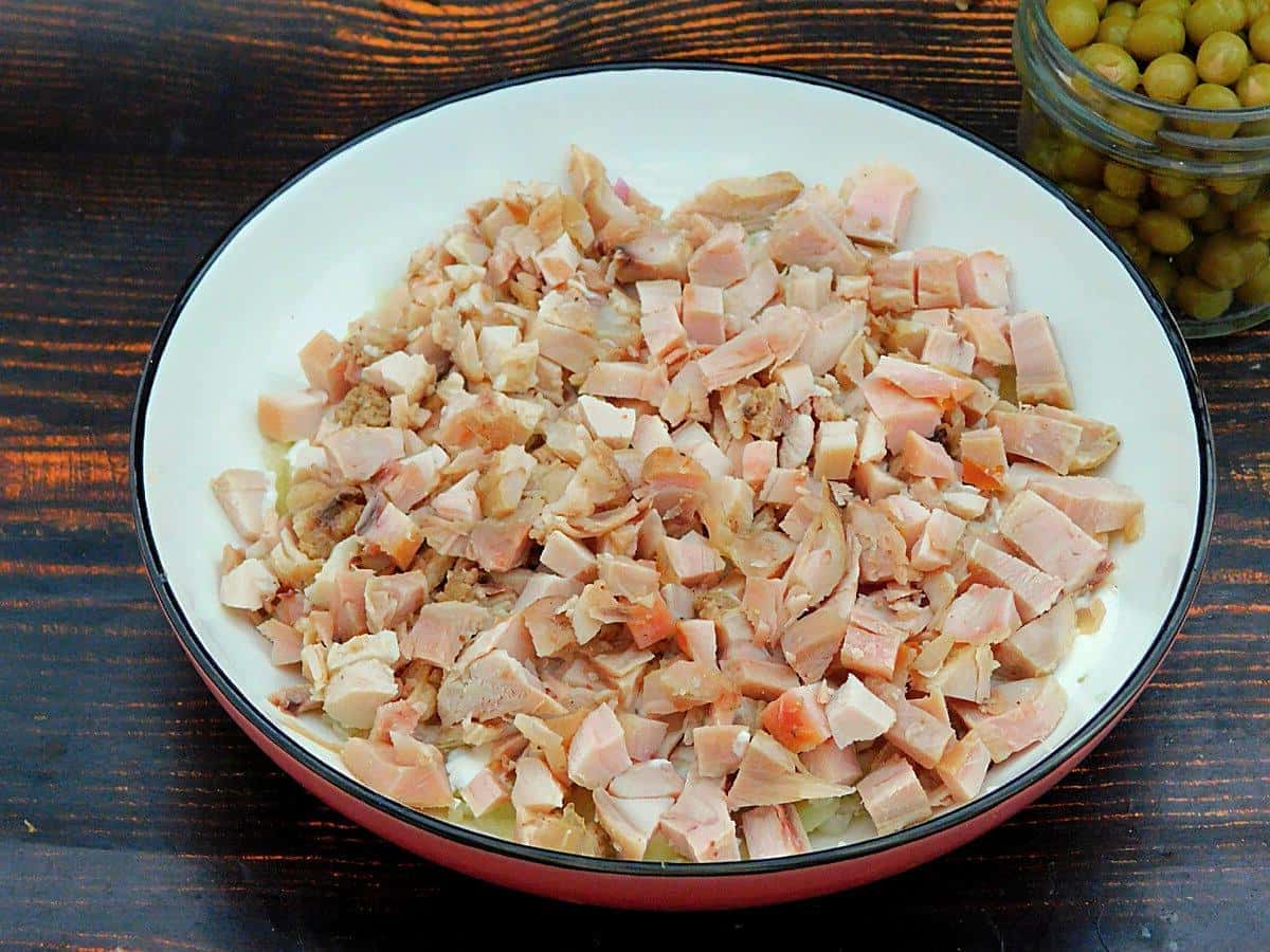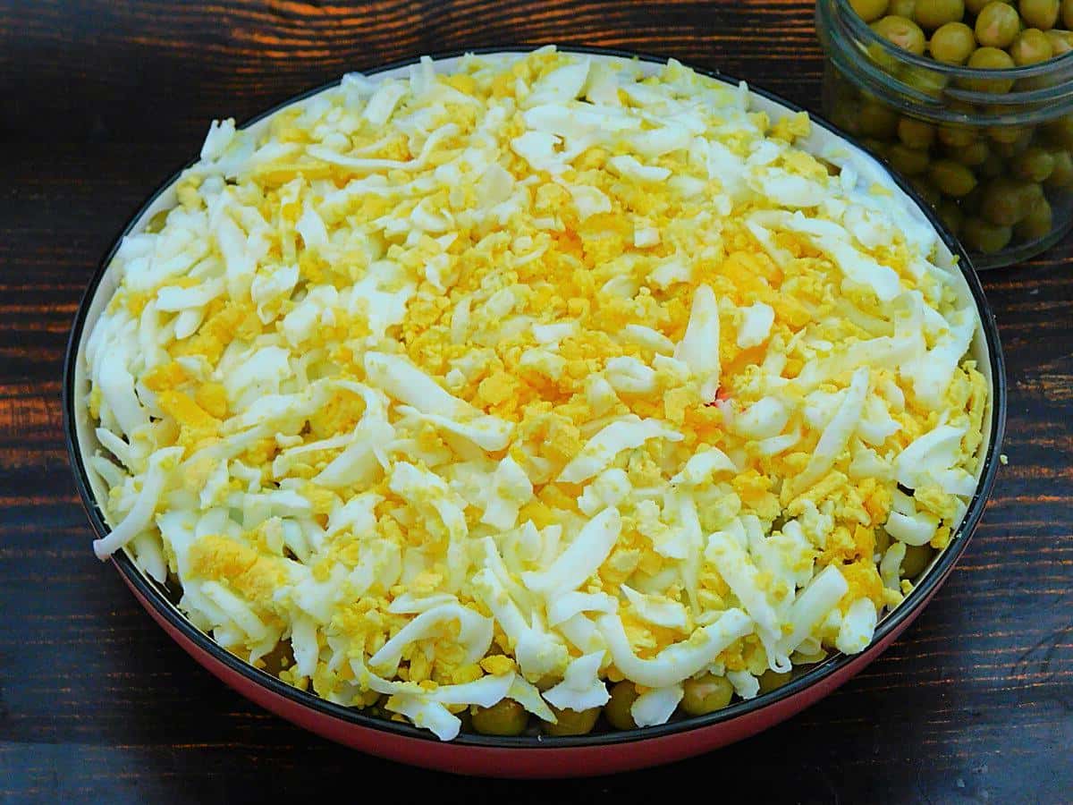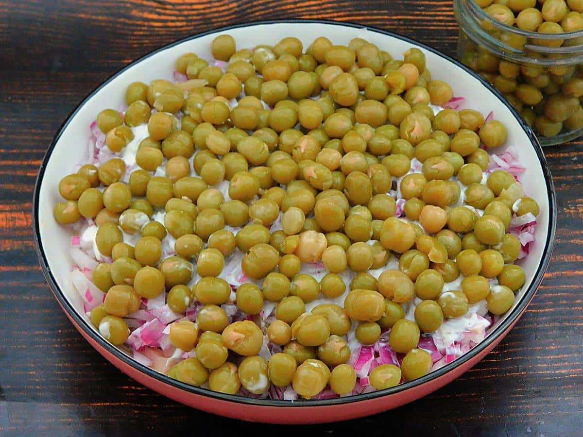 Далі шар консервованого зеленого горошку. Не забуваємо про майонез.