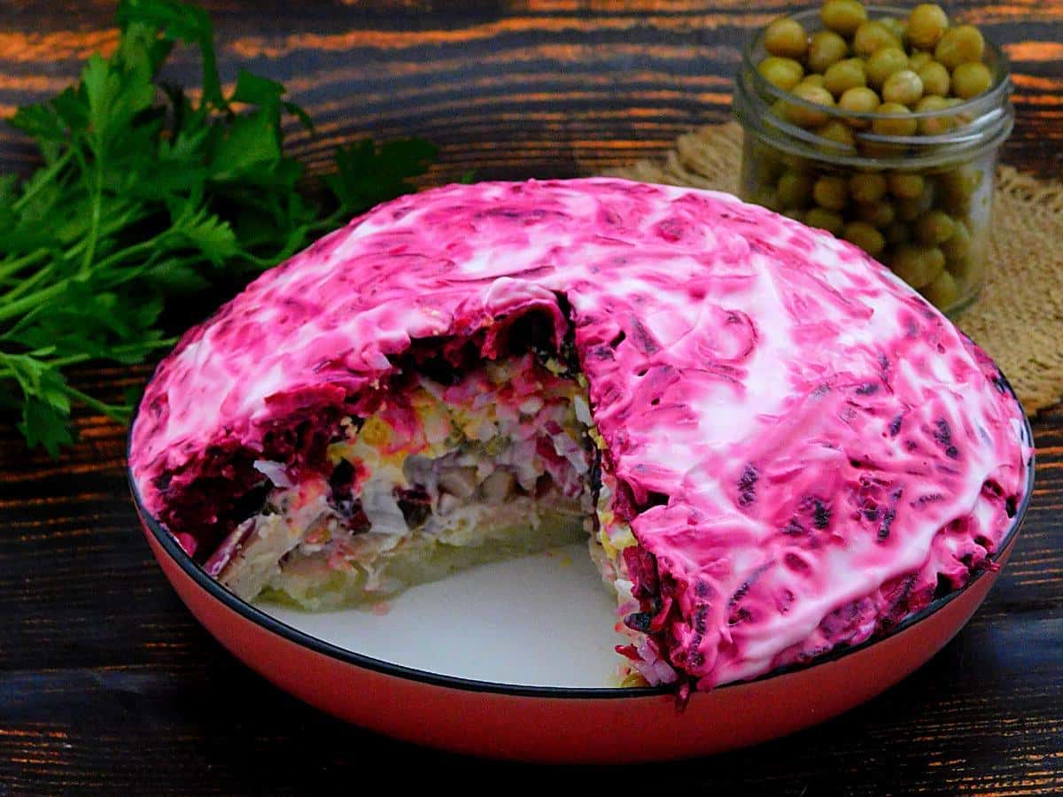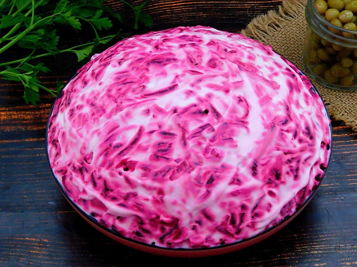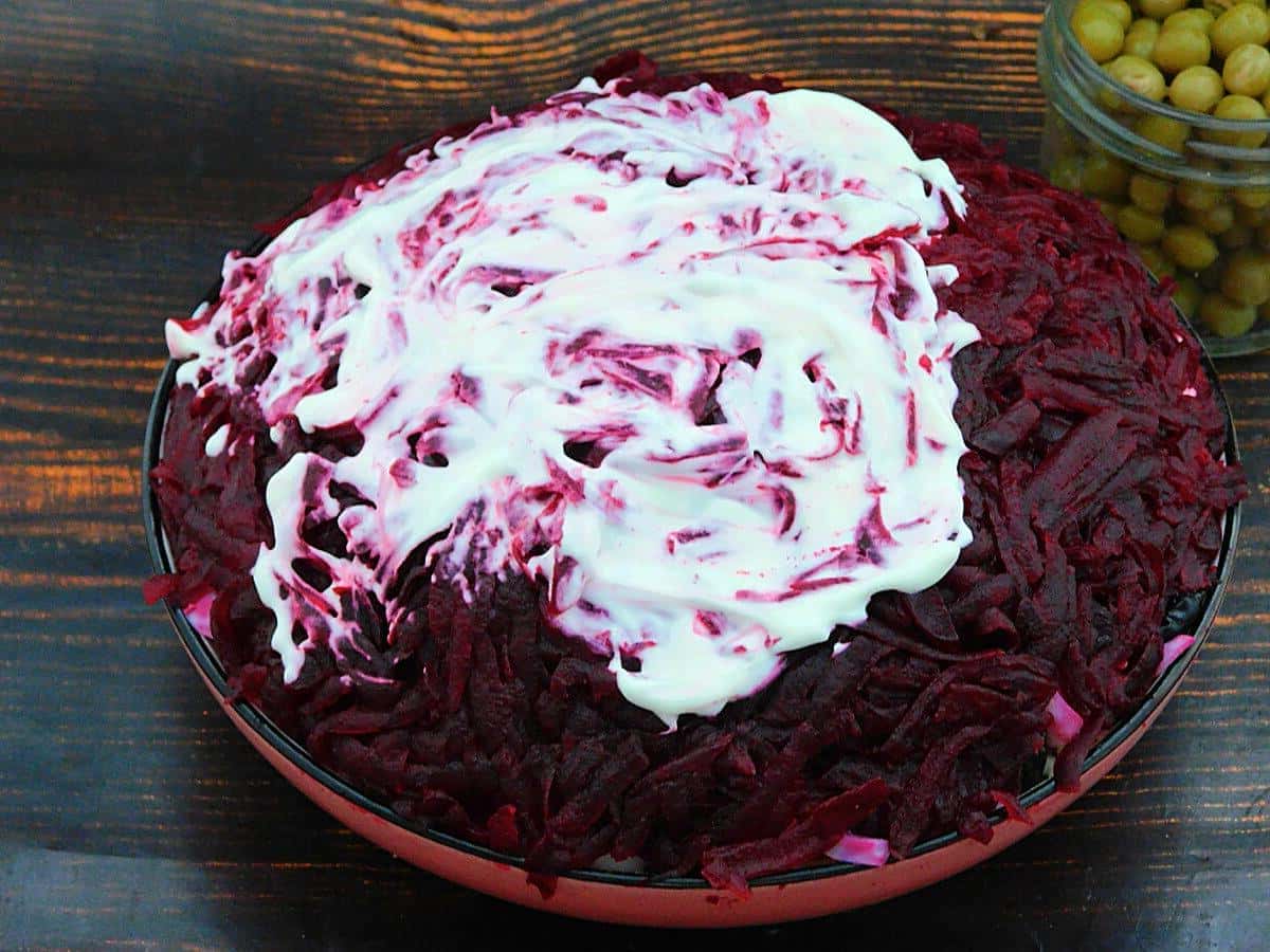 І, завершальний шар – тертий відварений буряк. Трохи притиснути зверху, щоб ущільнити страву. Змастити майонезом і прибрати в холодильник на пару годин для просочення і охолодження.