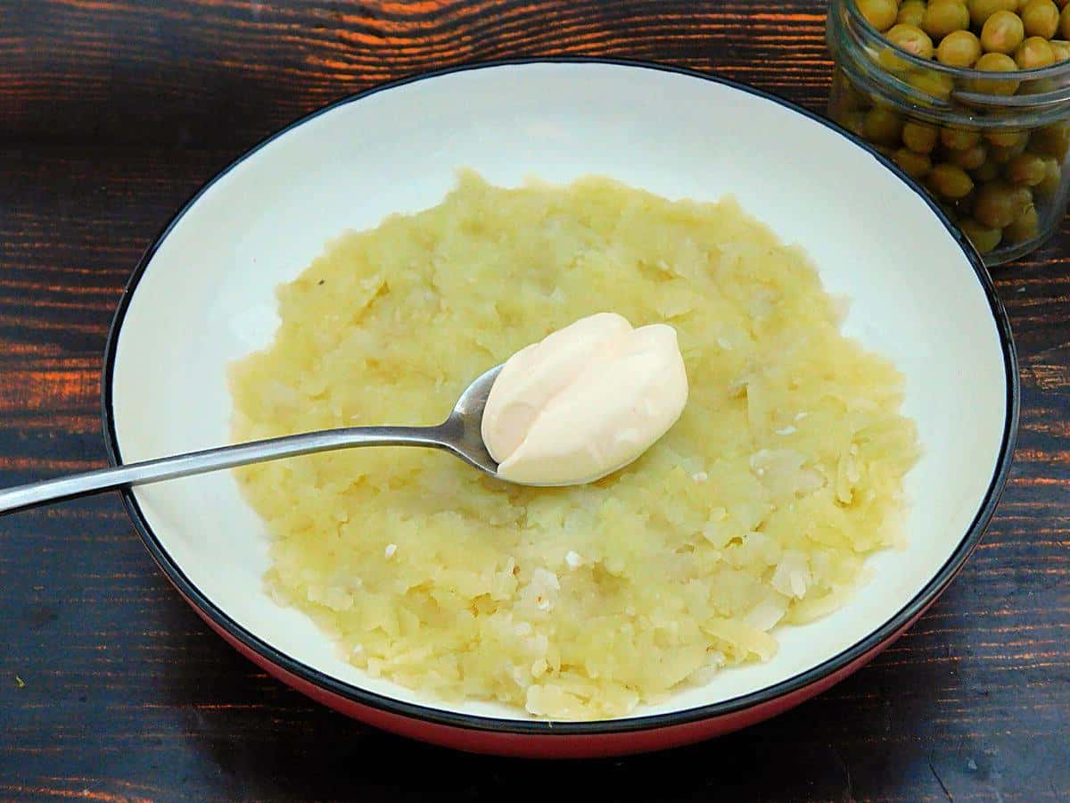 Салат можна збирати в кулінарному кільці або в неглибокій тарілці. На дно викласти терту картоплю. Цей і кожний наступний шар необхідно змащувати майонезом.