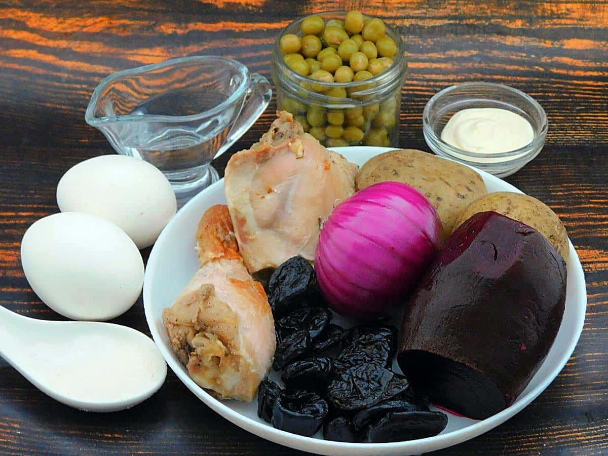 Підготувати все необхідне. Буряк, картоплю і яйця зварити заздалегідь і остудити. Овочі класти в каструлю прямо в мундирах. Куряче м’ясо згодиться будь-яке, тут запечені гомілки і стегна, підійде і відварна грудка. Якщо чорнослив твердовий, замочити його на кілька хвилин, якщо м’який – можна використовувати відразу.
