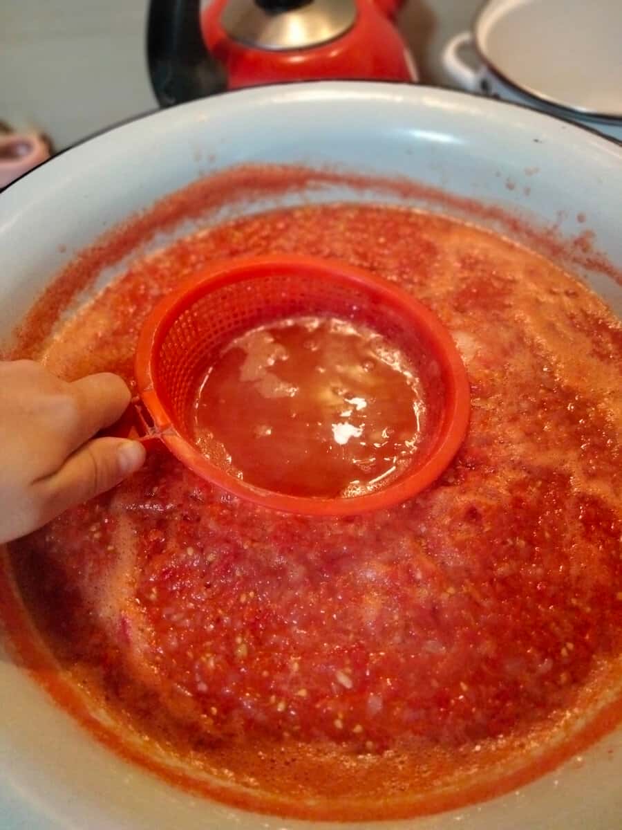Можна це справа випарювати кілька годин, але я роблю простіше. Після 20-30 хвилин кипіння маса ділиться на м’якоть і напівпрозорий сік, який в соусі не потрібен. Я його відціджую за допомогою друшлагу. Опускаю, як на фото і половником збираю.