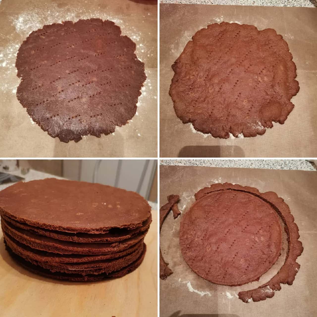 8. Гарячий корж відразу обрізати за шаблоном та остудити. Також спекти всі інші коржі.