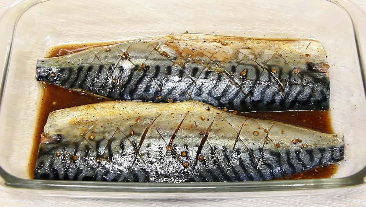 Маринадом смажте скумбрію з обох сторін, укладіть в форму для запікання шкірою вгору. Залиште на 15 хвилин промаринуватися.
