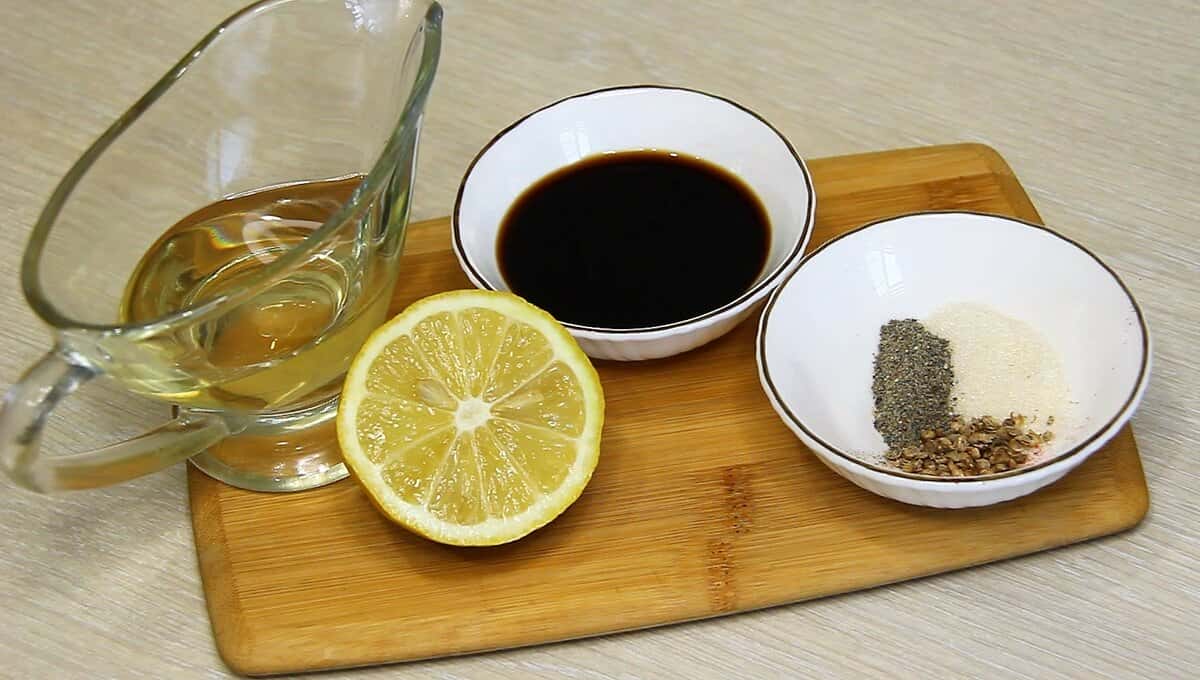 Для маринаду з’єднайте соєвий соус, лимонний сік, олію без запаху, цукор, чорний мелений перець і мелений коріандр.