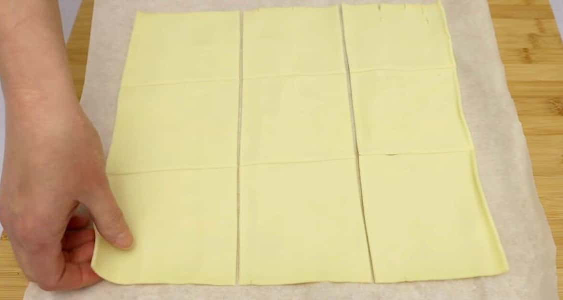 Листкове тісто розрізаємо на 9 квадратів.