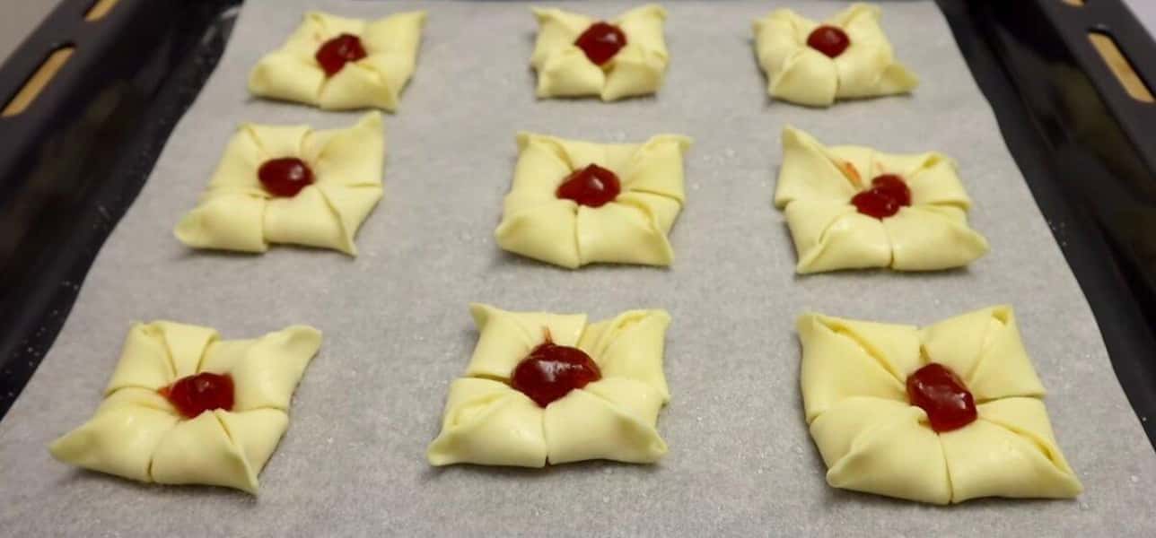 Змащуємо слойки водою або молоком, посипаємо зверху цукром і в центр викладаємо варення або джем (у мене полуничне варення). Випікаємо 20 хвилин, в розігрітій духовці до 200 градусів.