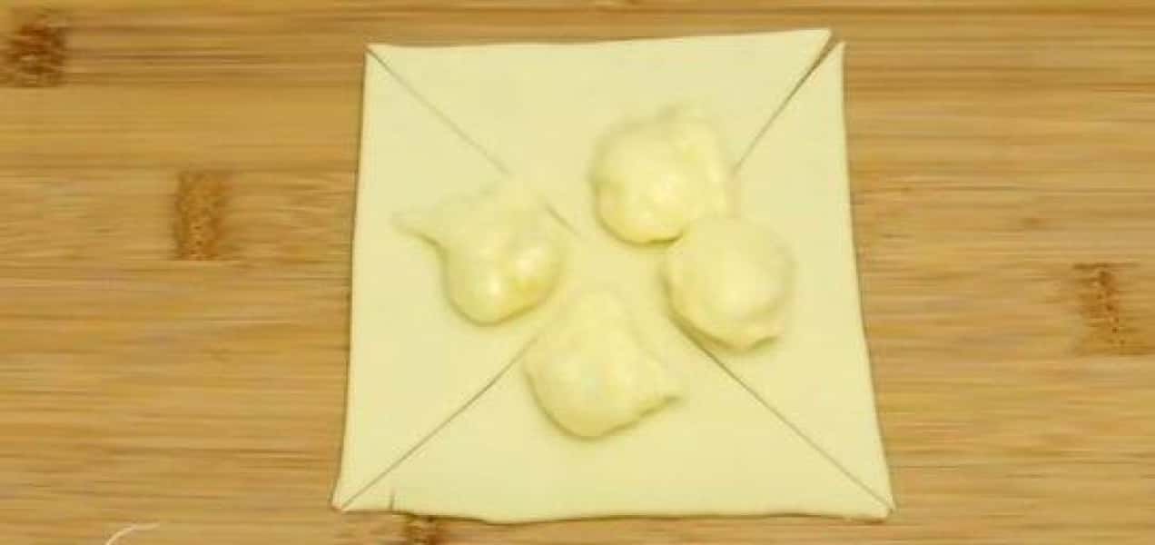 На кожному квадратику робимо надрізи на кутах. І в кожен трикутник викладаємо крем.