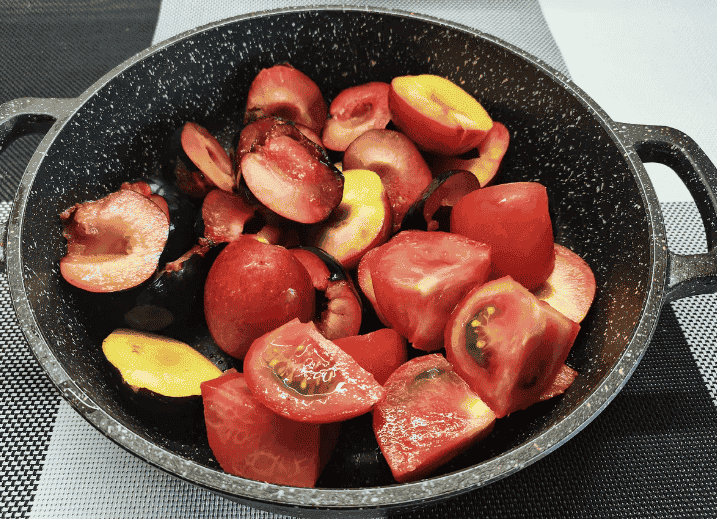 ✅Нарізаю на половинки, хоча це не важливо, головне видалити кісточку. Додала трохи для смаку помідорів.