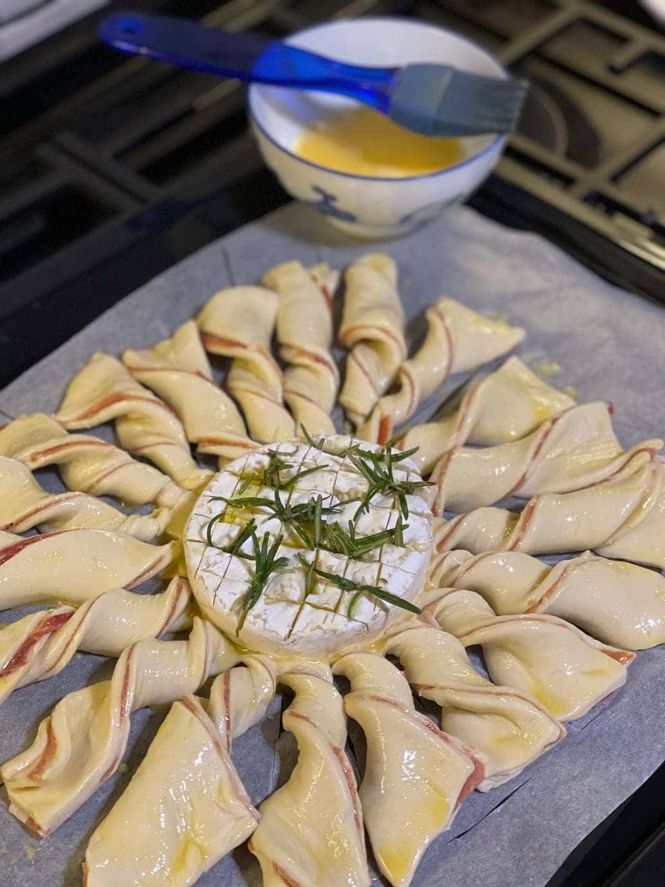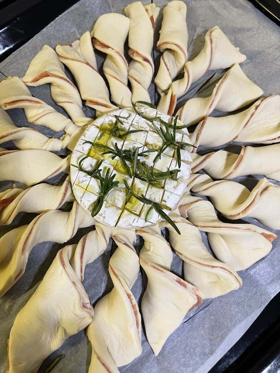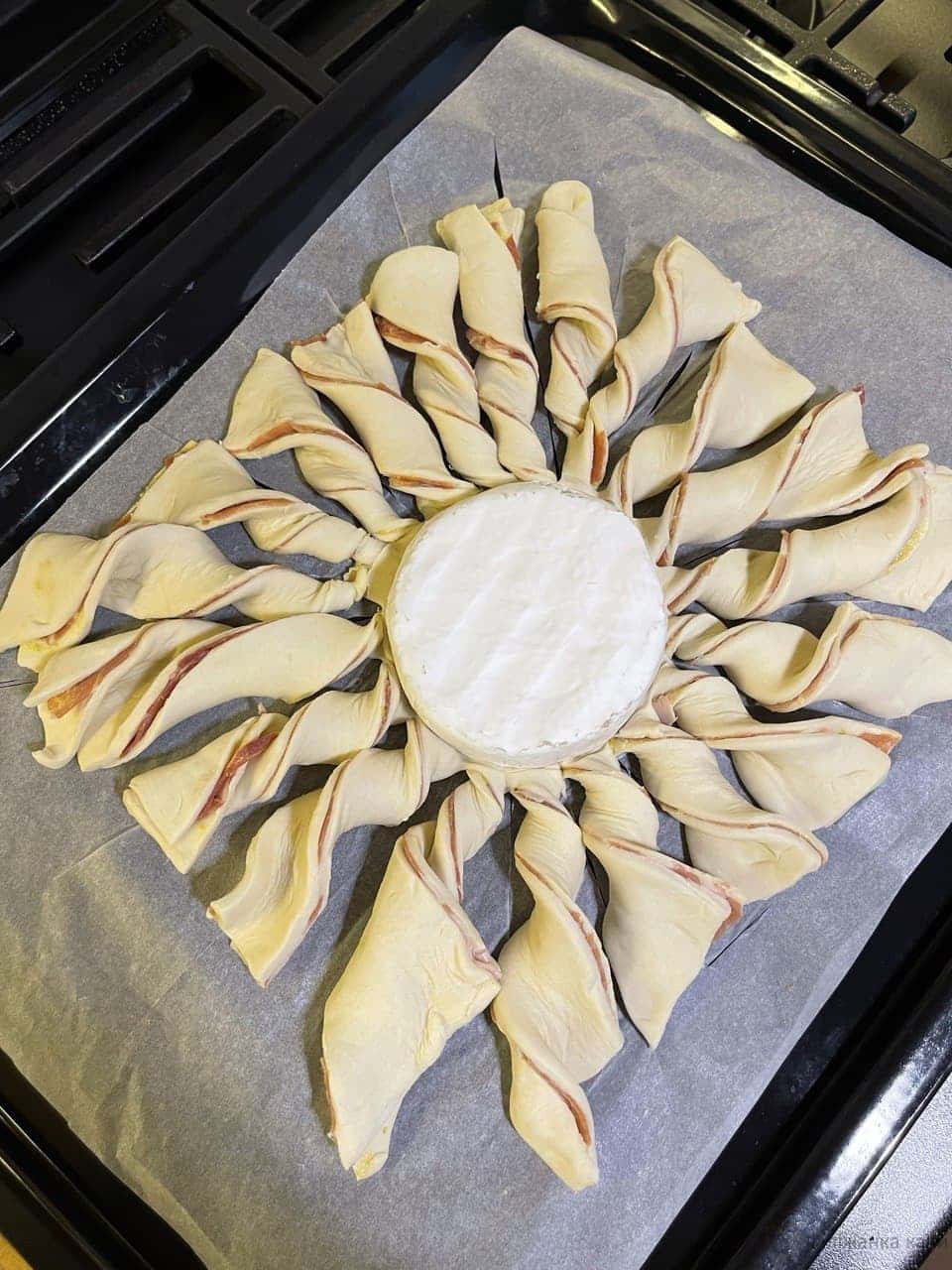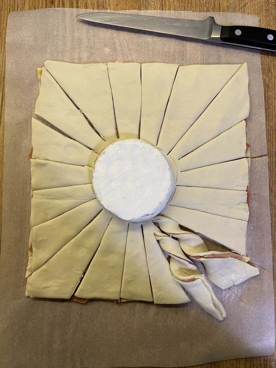 Ножем розрізати тісто на «промінчики», починаючи від середини, де лежить сир і до країв, як на фото.
