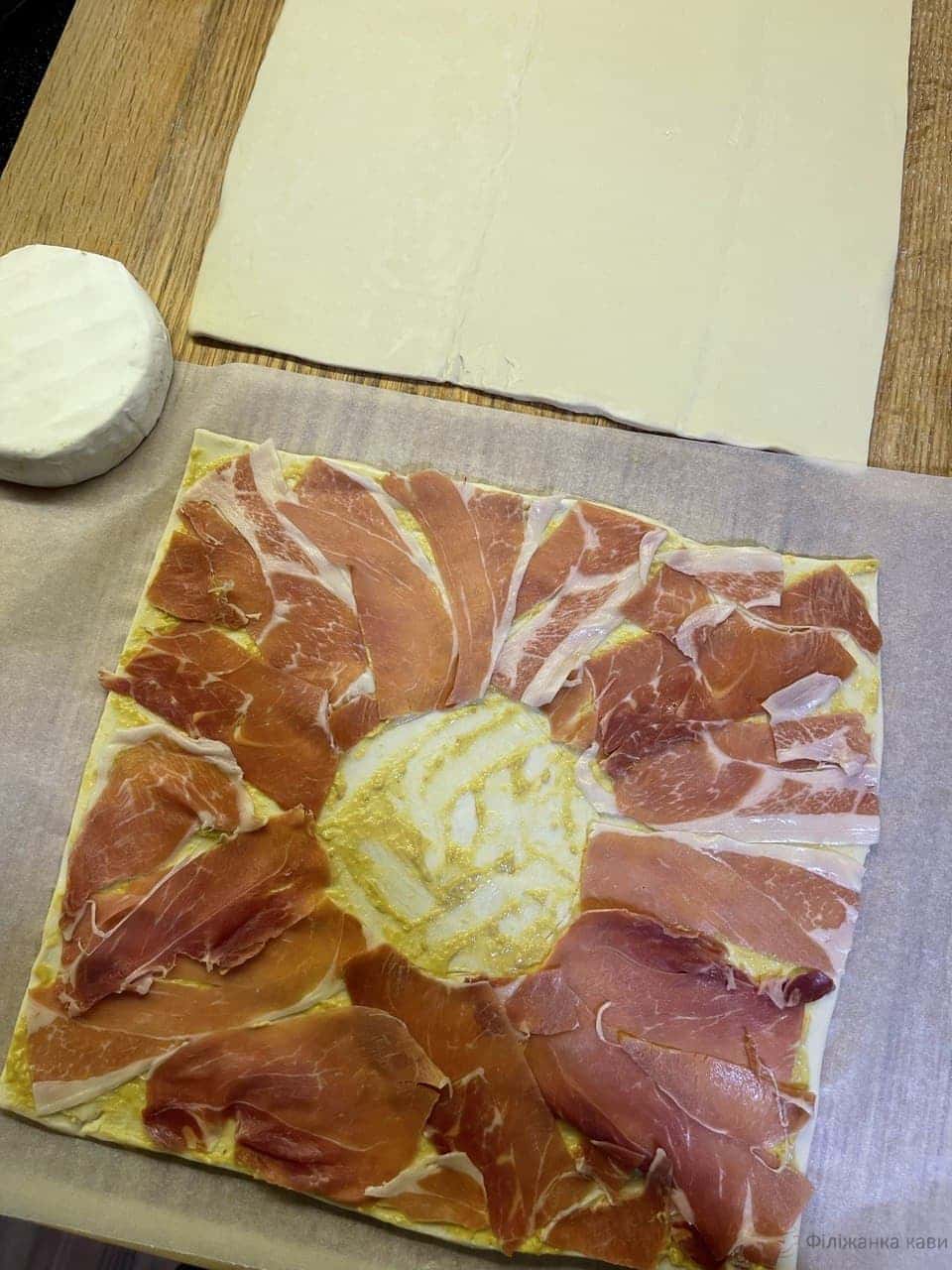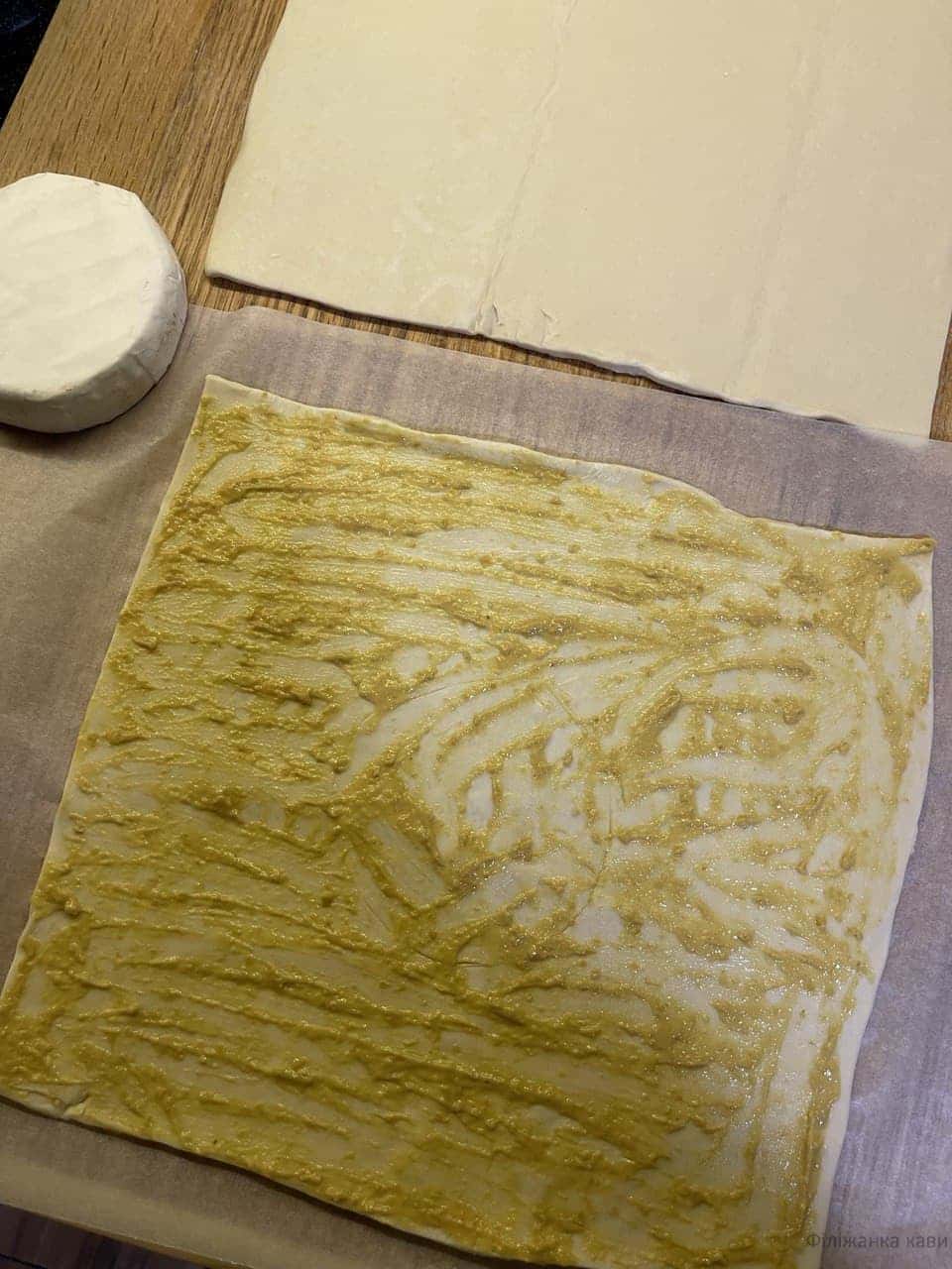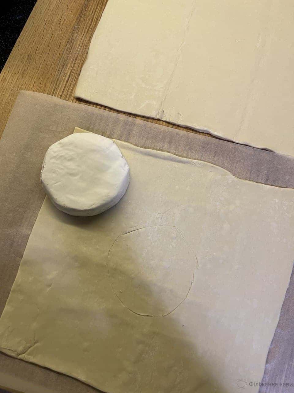Викласти один квадрат на пергамент. По середині цієї частини покласти сир і ножем злегка обвести контур.
