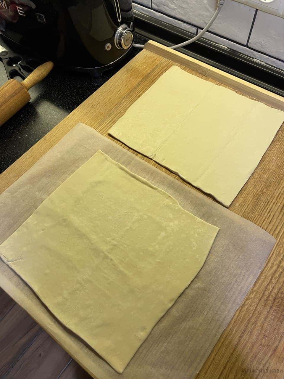 Листкове тісто розморозити, злегка розкачати і розрізати на 2 рівні квадрати.