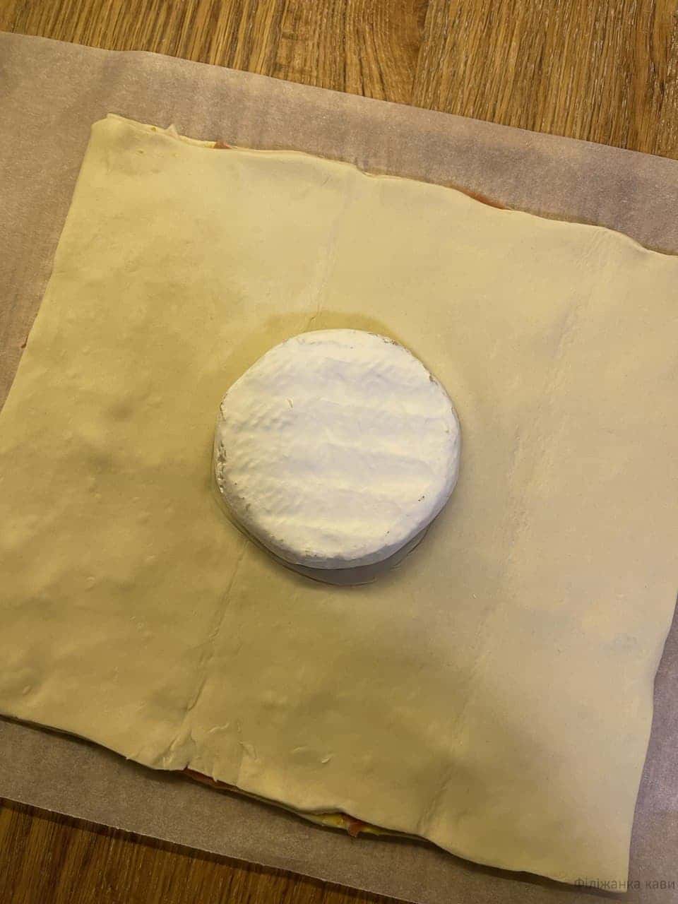 Накрити другою частиною тіста. Злегка пальцями втиснути середину, де буде лежати сир, утворивши для нього ніби мисочку. В цю серединку покласти сир.