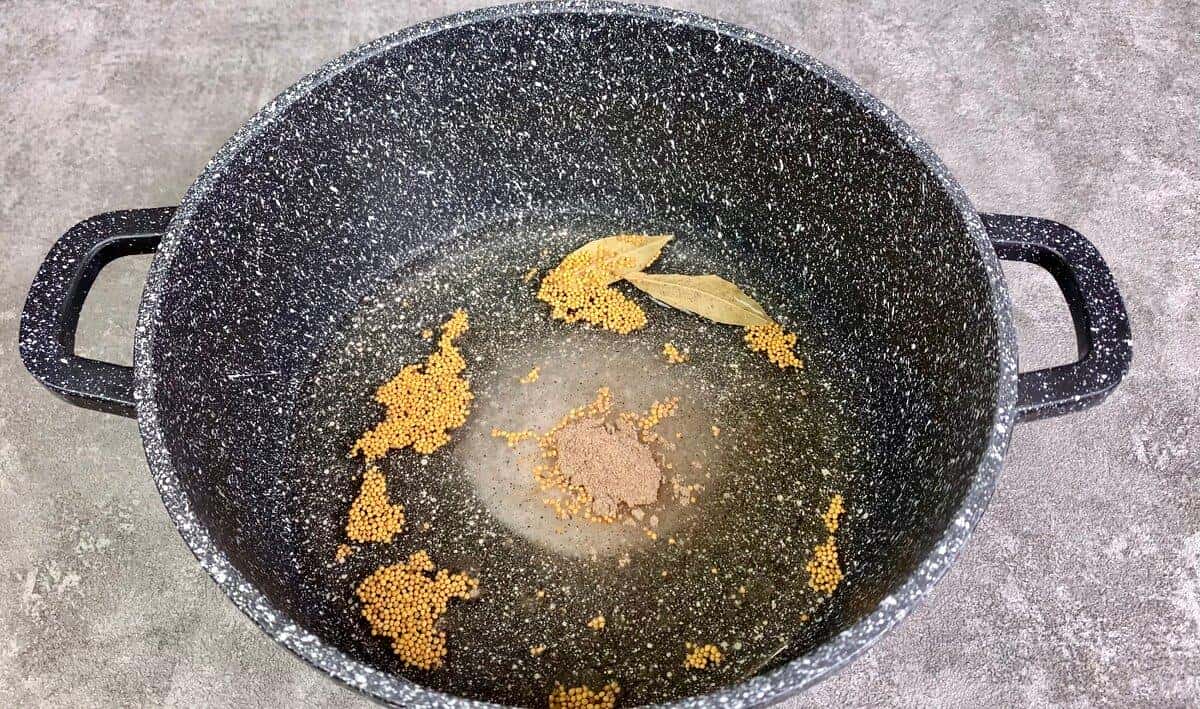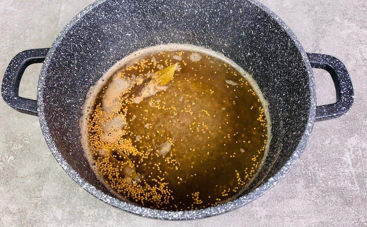 1. У каструлю з водою додаємо цукор, сіль, лавровий лист, гірчицю в зернах, чорний мелений перець і винний оцет.